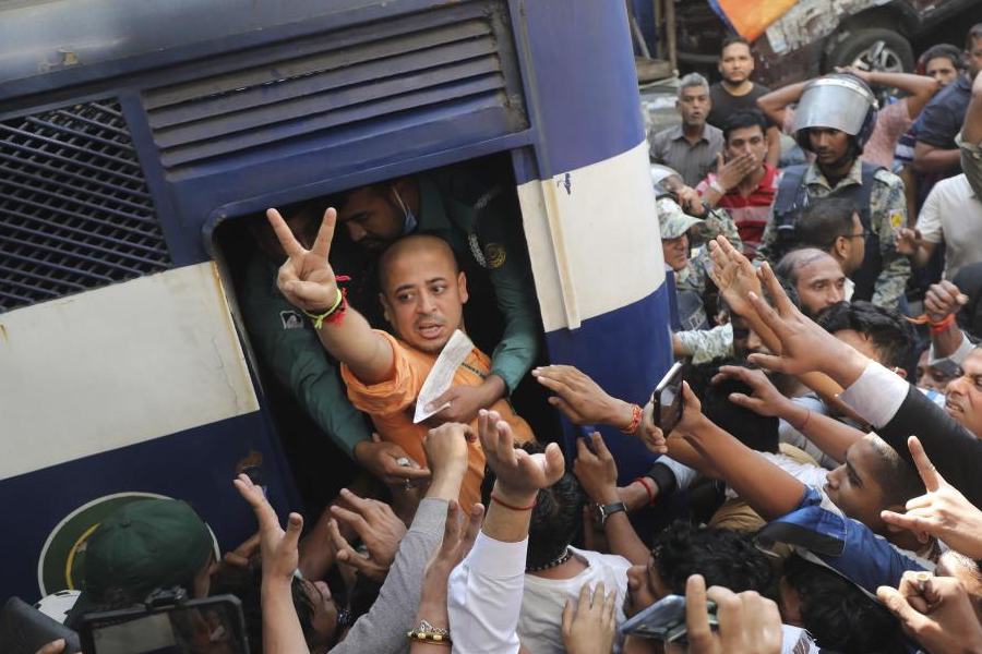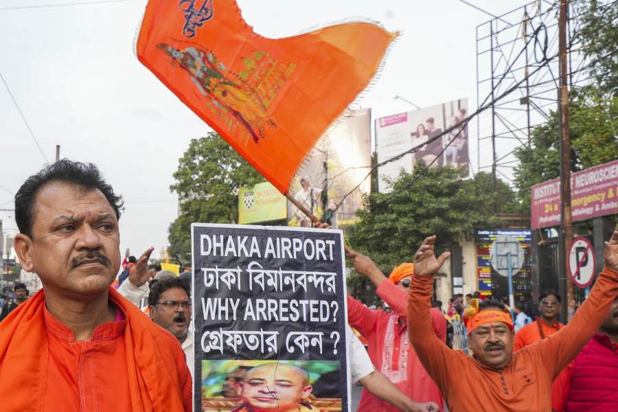 Hindu organisations continued with their protests across India on Thursday. In Calcutta, the Bangiya Hindu Jagaran Manch organised a rally to voice opposition to what they termed the ‘targeting of Hindu leaders’ in Bangladesh. The marchers attempted to proceed from Sealdah station to the Bangladesh Deputy High Commission but were stopped by police near Beckbagan.