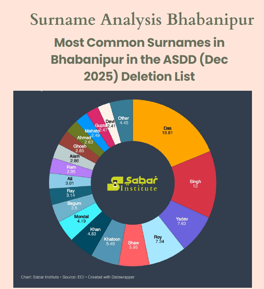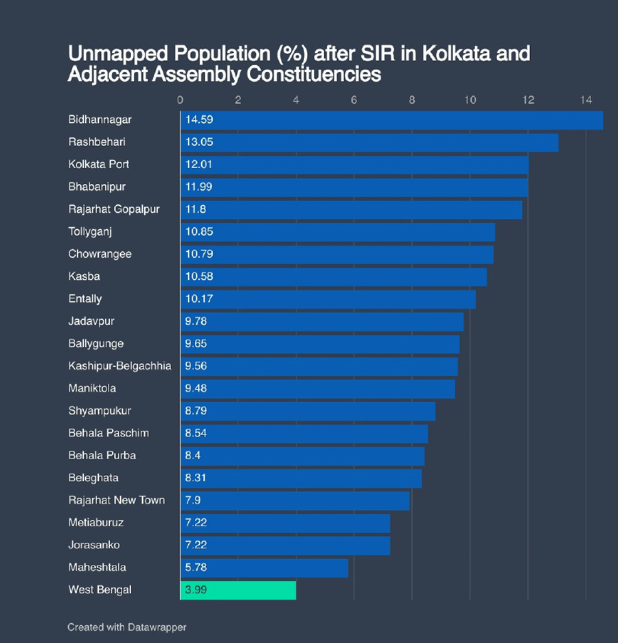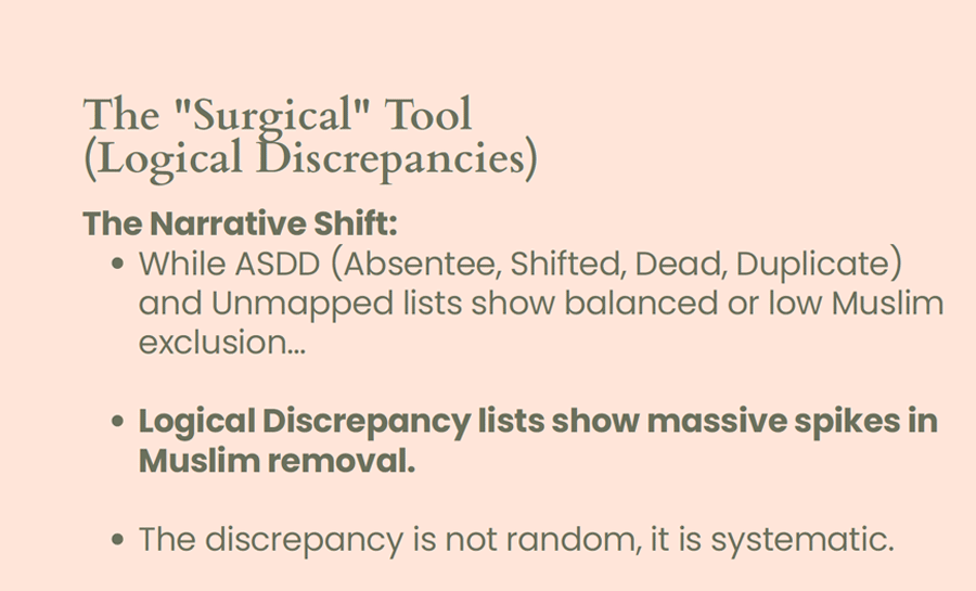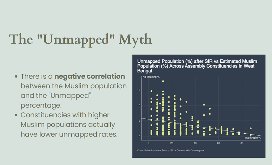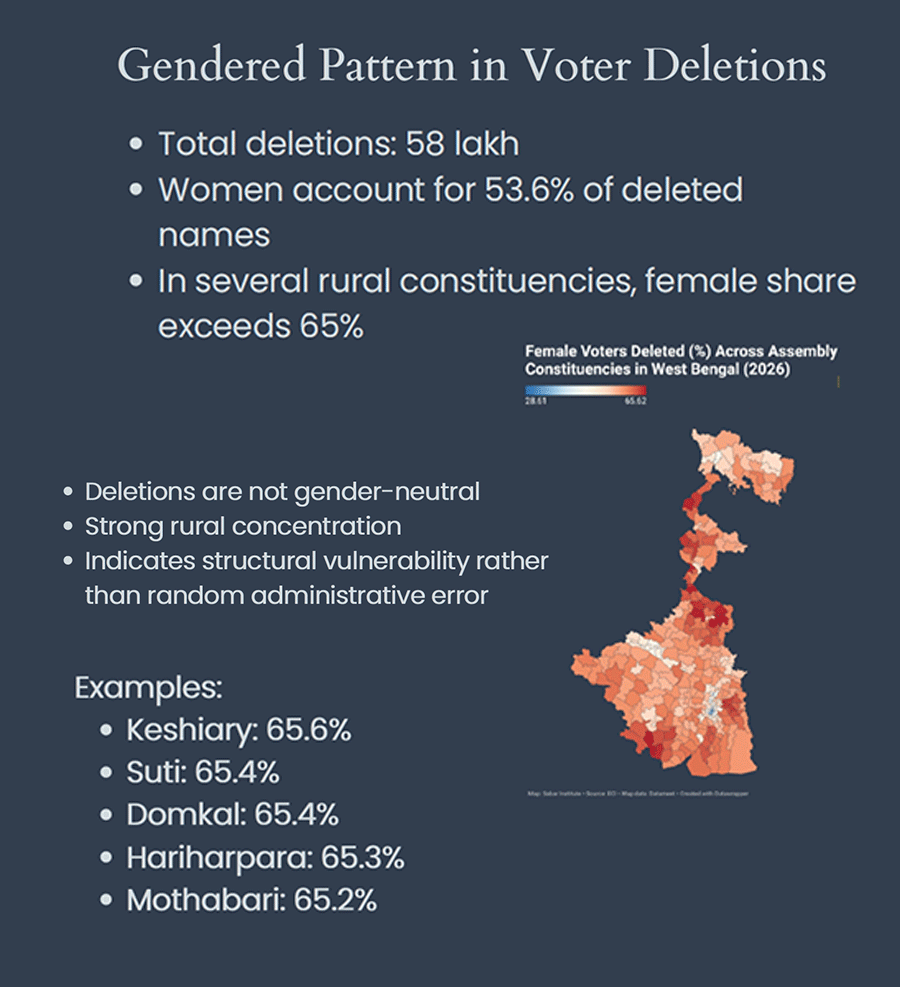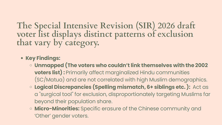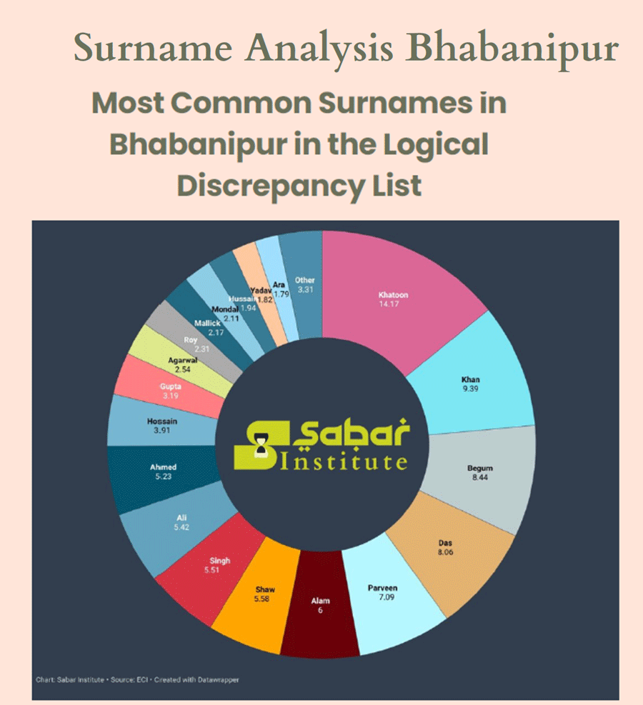 A disproportionate percentage of Muslim voters were reported under "logical discrepancies" and women account for more than half of removed names in many places in the special intensive revision of electoral rolls underway in Bengal, according to data presented at an event in Delhi on Monday.
