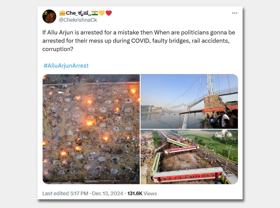 Another user raised a question about double standards, posting: "If Allu Arjun is arrested for a mistake, when are politicians going to be arrested for their mess-ups during COVID, faulty bridges, rail accidents, and corruption?"