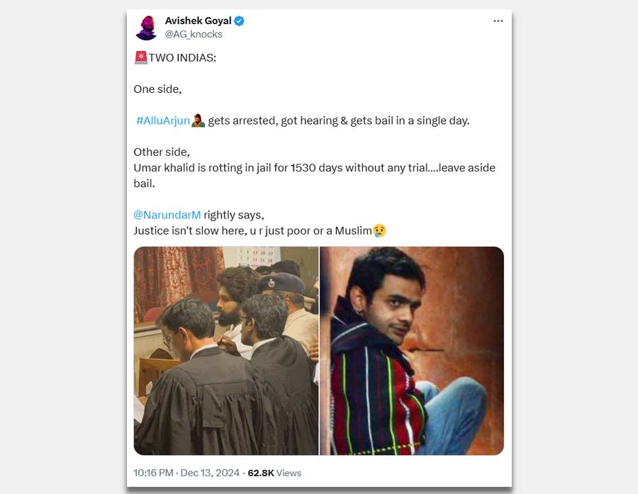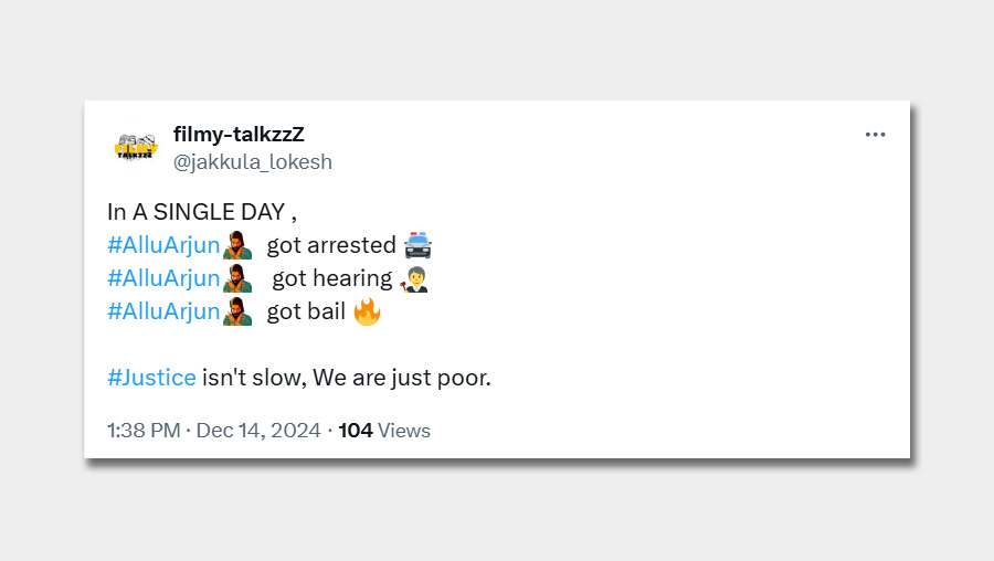 The speed of Allu Arjun’s release caught the attention of many, with comparisons about cases. A post summarised it as: "In a single day, Allu Arjun got arrested, got a hearing, and got bail. Justice isn’t slow; we’re just poor."
