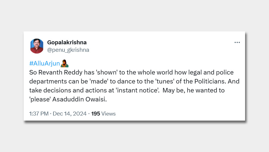Some users alleged political interference, as one user posted: "So Revanth Reddy has 'shown' to the whole world how legal and police departments can be 'made' to dance to the 'tunes' of politicians. Maybe he wanted to 'please' Asaduddin Owaisi."