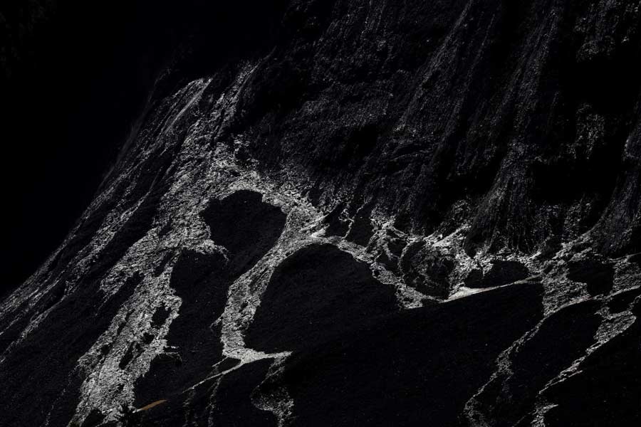 The debris has carved a grey gash into the wooded mountainside, stripping it bare of trees and leaving channels of water seeping over the mass of rock and earth below. A thin cloud of dust hung in the air over the Kleines Nesthorn mountain where the rockslide occurred and a helicopter buzzed overhead.