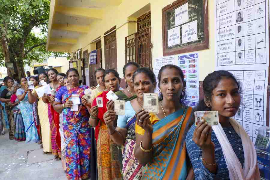 Women show their identity cards as they queue to vote at a polling station during the Tamil Nadu Assembly elections, in Chennai, Thursday, April 23, 2026. PTI picture