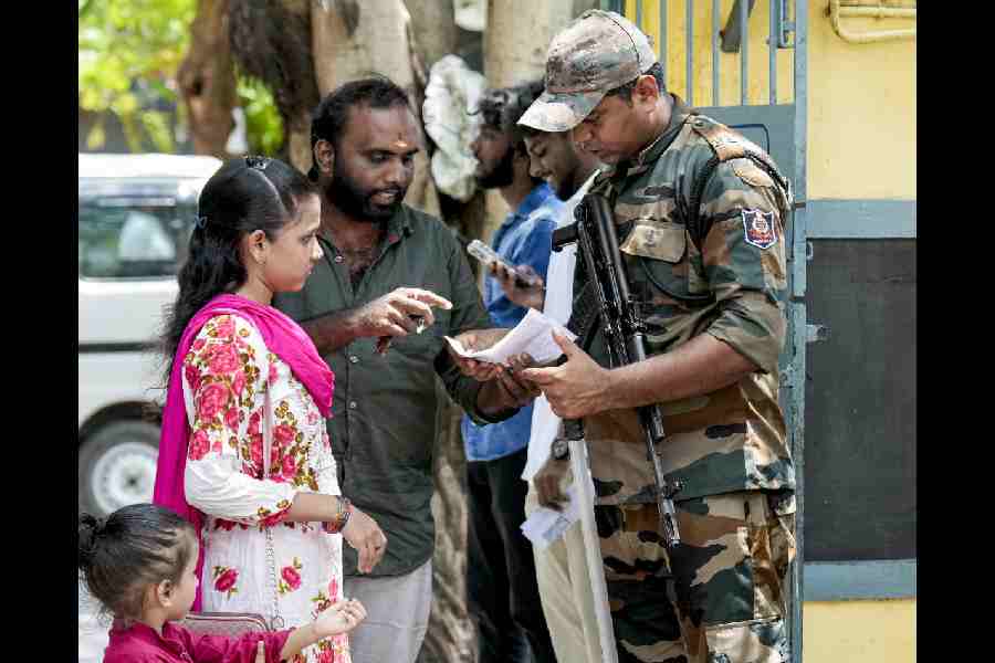 A security personnel checks the name of the voter during the Tamil Nadu Assembly elections, in Chennai, Thursday, April 23, 2026. PTI picture