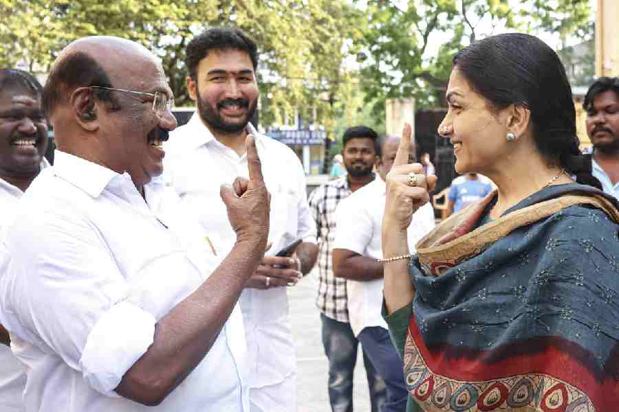AIADMK candidate from Royapuram constituency, D. Jayakumar, left, and BJP leader Khushbu show their ink-marked fingers after casting votes in the Tamil Nadu Assembly elections, at a polling station in Chennai, Thursday, April 23, 2026. PTI picture