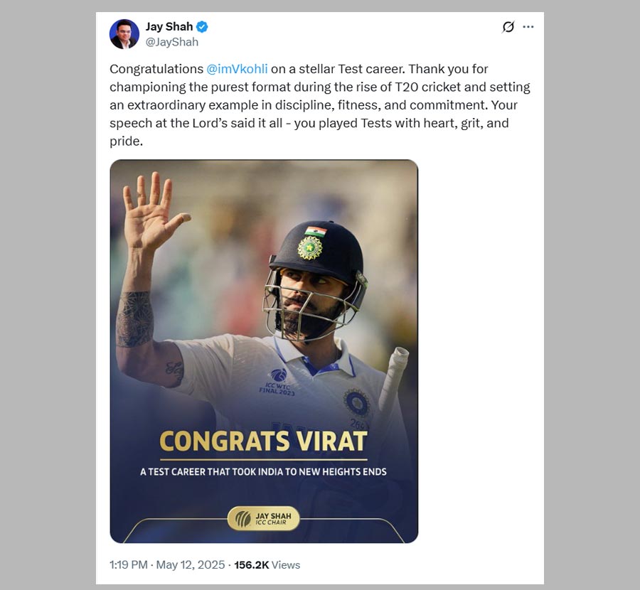 “Congratulations @imVkohli on a stellar Test career. Thank you for championing the purest format during the rise of T20 cricket and setting an extraordinary example in discipline, fitness, and commitment. Your speech at the Lord’s said it all - you played Tests with heart, grit, and pride,” wrote Jay Shah on X.