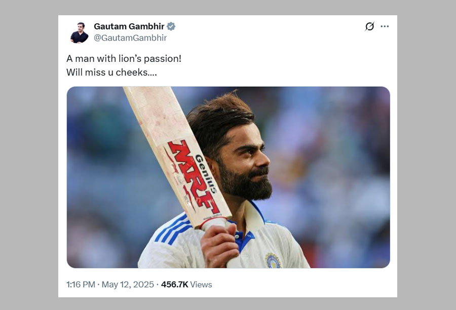 India head coach Gautam Gambhir said Kohli has a lion's passion and that he will miss the ‘Cheeku’ of Indian cricket.
