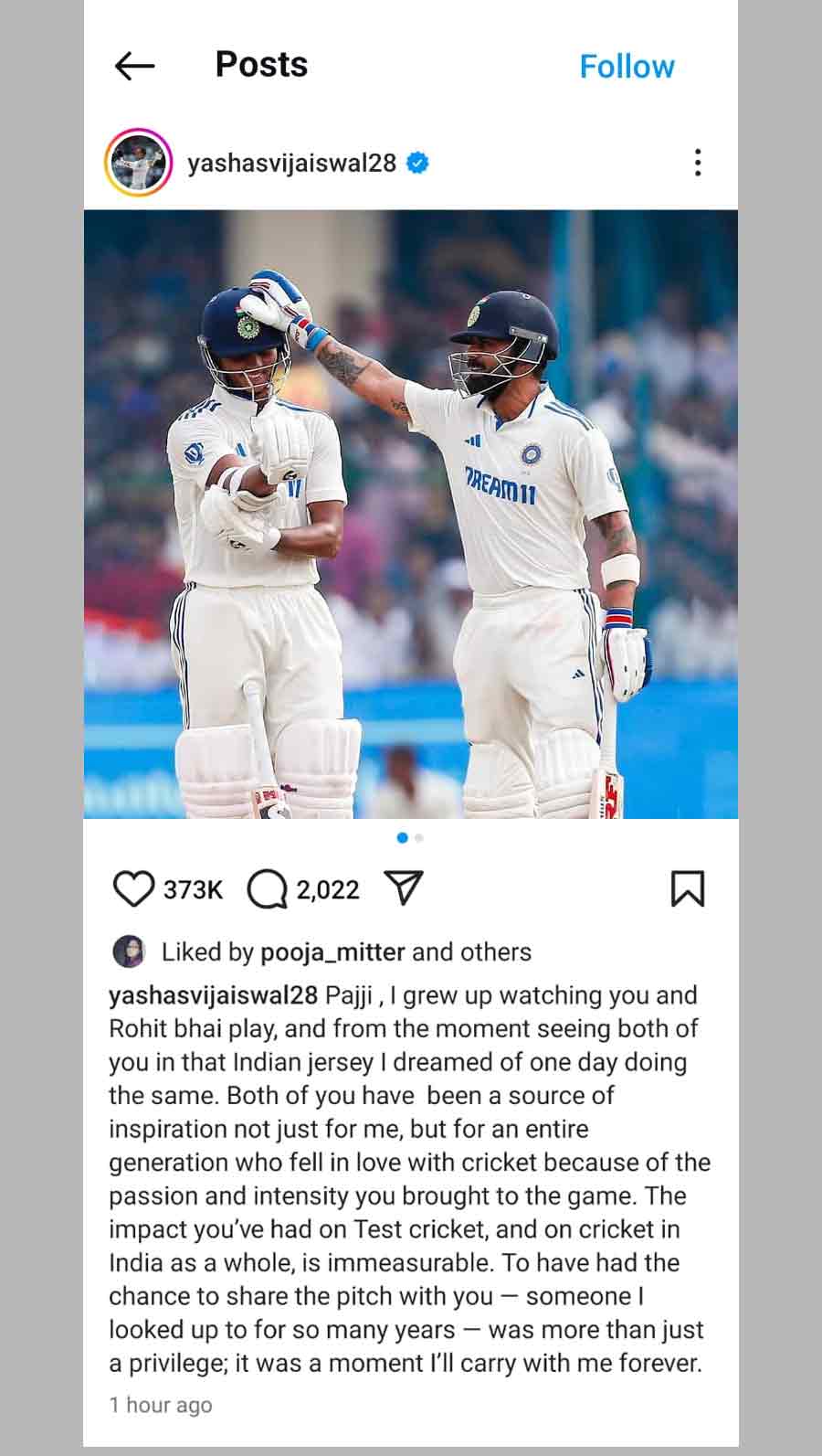 “Pajji, I grew up watching you and Rohit bhai play, and from the moment seeing both of you in that Indian jersey I dreamed of one day doing the same. Both of you have been a source of inspiration not just for me, but for an entire generation who fell in love with cricket because of the passion and intensity you brought to the game,” he wrote on Instagram.