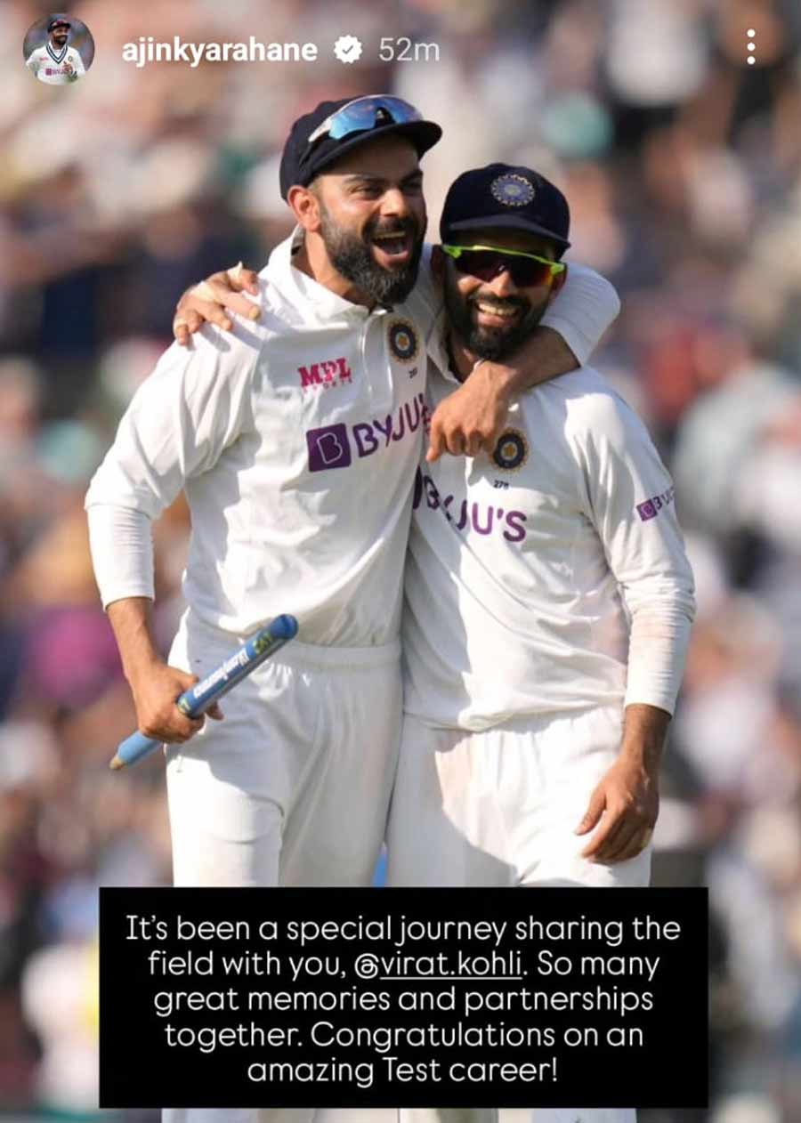 Ajinkya Rahane, who served as Kohli's deputy for several years, posted a heartfelt Instagram story for the former India captain, saying it was a “privilege to share the dressing room with him.”