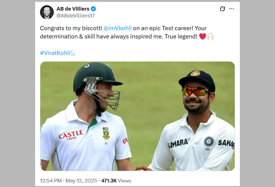 Taking to X, he wrote, “Congrats to my biscotti @imVkohli on an epic Test career! Your determination & skill have always inspired me. True legend!”