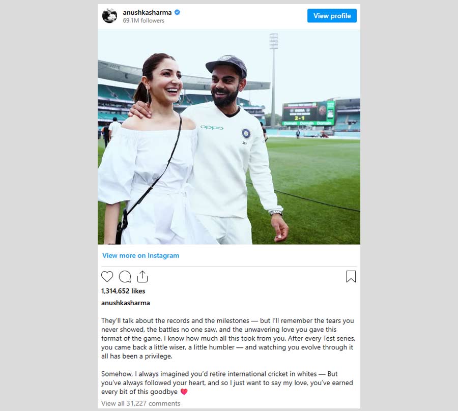 In a lengthy note, she wrote, "They’ll talk about the records and the milestones — but I’ll remember the tears you never showed, the battles no one saw, and the unwavering love you gave this format of the game. I know how much all this took from you. After every Test series, you came back a little wiser, a little humbler — and watching you evolve through it all has been a privilege. Somehow, I always imagined you’d retire international cricket in whites — But you’ve always followed your heart, and so I just want to say my love, you’ve earned every bit of this goodbye (sic)."