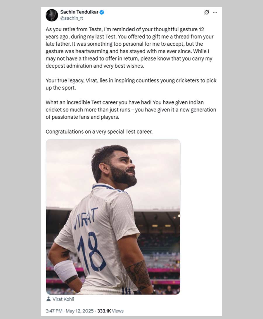 "While I may not have a thread to offer in return, please know that you carry my deepest admiration and very best wishes. Your true legacy, Virat, lies in inspiring countless young cricketers to pick up the sport," Tendulkar said.