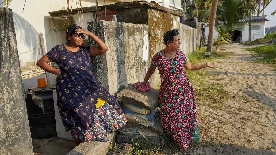 Hima Rose, left, and neighbor Reetha Maria, talk in Kochi, Kerala, India, March 4, 2023, about their experience during Cyclone Tauktae in 2021. "I was shocked to see waves carrying huge granite stones of the old sea wall and tons of water gushing directly to my home," Maria said. "You may have no idea how many days that we took to clean the stinking mud and filth brought by the seawater."
