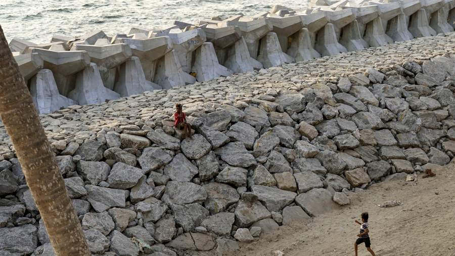 As the sun sets in the evenings, children climb the slanting granite structures and sit atop the tetrapods. An abandoned one-story house, battered by the cyclone, remains standing just some meters (yards) away from the sea wall, a constant reminder of the harrowing aftermath of the cyclone’s sea surge, displacements and relief camps. For those who can't afford to leave their homes, and live and work along the coast, the construction of the sea wall is priceless but not a complete fix, as workers race to finish before the next monsoon, which could be any day now.