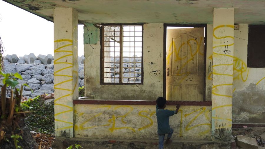 A boy plays on a home near a newly built sea wall in Kochi, Kerala, India, on March 4, 2023, that was abandoned after the 2021 Cyclone Tauktae. The house remains a constant reminder of the harrowing aftermath of the cyclone's sea surge, displacements and relief camps.
