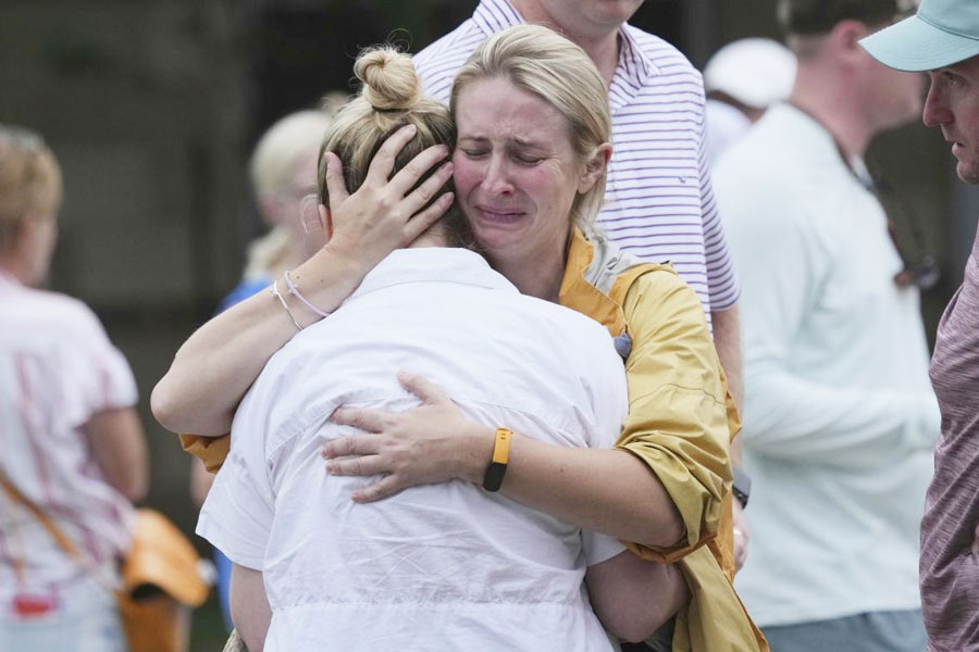 Later, a girl in a white “Camp Mystic” T-shirt and white socks stood in a puddle, sobbing in her mother's arms.