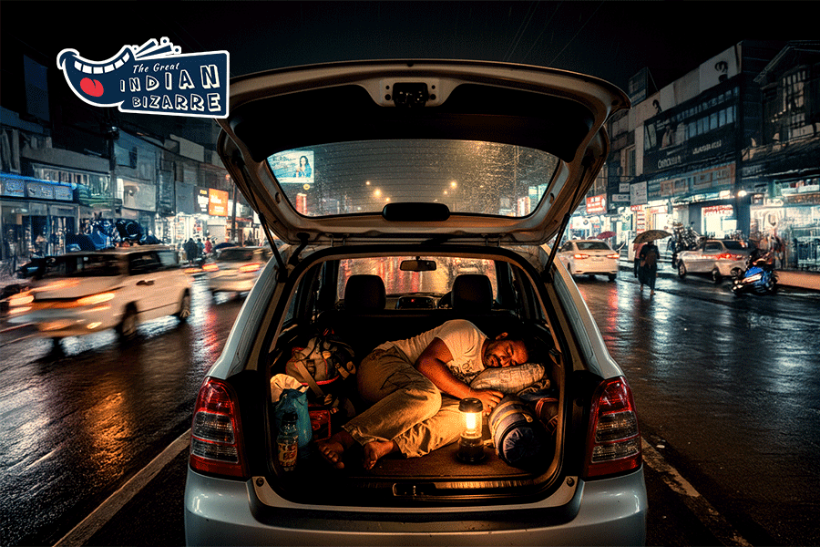 A routine police check near Delhi’s Signature Bridge turned into an accidental comedy sketch after officers opened the boot of a Maruti Suzuki Swift and discovered a man in a full suit sleeping inside, earphones on, and legs stretched.