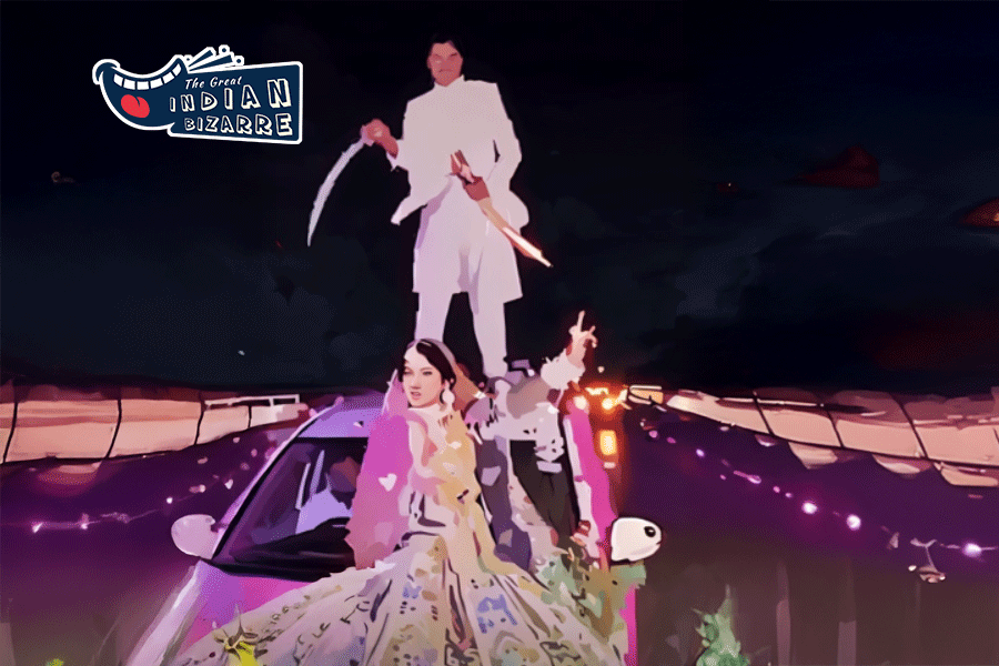 The dulhan danced daintily from the car's bonnet while the dulha waved a sword like he was auditioning for a role in Baahubali 3.