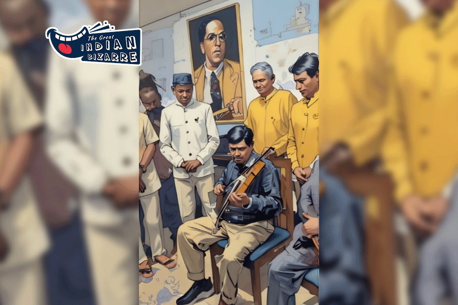 While dragging the bow across the strings like someone brushing a cat backwards, he paid homage to Babasaheb’s musical side. The attendees could have been descendants of Ambedkar, some Buddhist leaders, artists and several VIPs who nodded politely, possibly in emotional uncertainty.