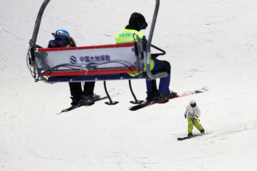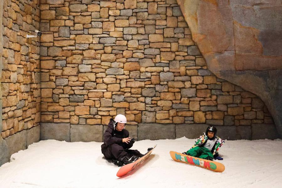 Visitors snowboarded, skied and had snowball fights on the slopes of the 98,000 square-metre (117,207 square yard) Shanghai L+SNOW Indoor Skiing Theme Resort, where temperatures are maintained at 5°C (41°F) or less all year round.