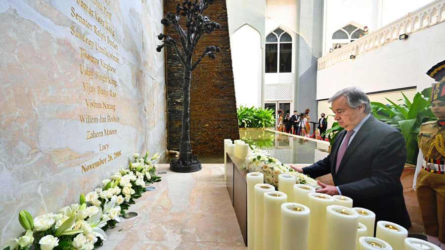 UN Secretary General Antonio Guterres on Wednesday paid tributes to the victims of the 26/11 terror attacks at the Taj Mahal Palace hotel in Mumbai on the first day of his three-day visit to India. Accompanied by Maharashtra Chief Minister Eknath Shinde and Deputy CM Devendra Fadnavis, Guterres placed a foral wreath at the 26/11 attacks memorial in the hotel. It is the UN chief's first visit to India since his second term in office commenced in January. He had earlier visited the country in October 2018 during his first term at the top office.