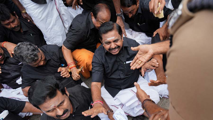 The Opposition AIADMK presented a picture of contrast on Wednesday with former Chief Minister O Panneerselvam attending the Assembly session while the leader of opposition K Palaniswami staged a protest here, demanding that the Speaker de-recognise the former as deputy floor leader of the party.