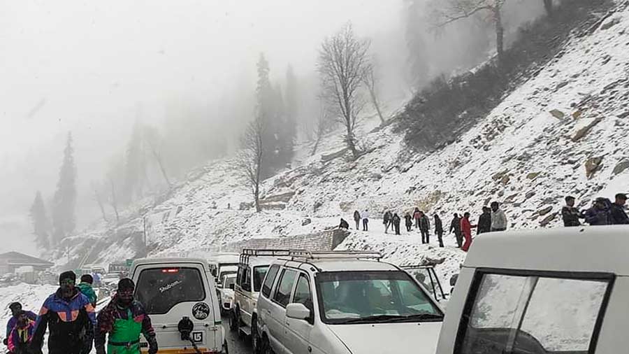 The vehicles were stuck as slippery conditions prevailed after snowfall at the tunnel on the Manali-Leh highway and adjoining areas on Thursday.