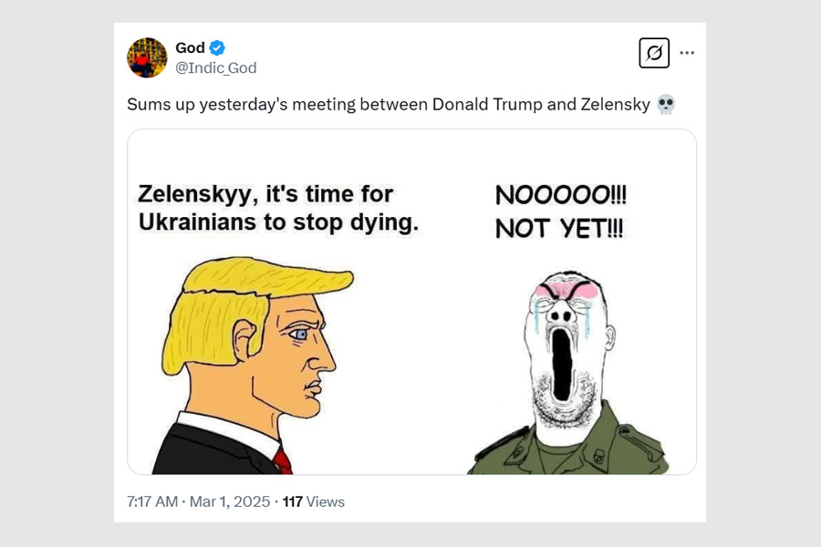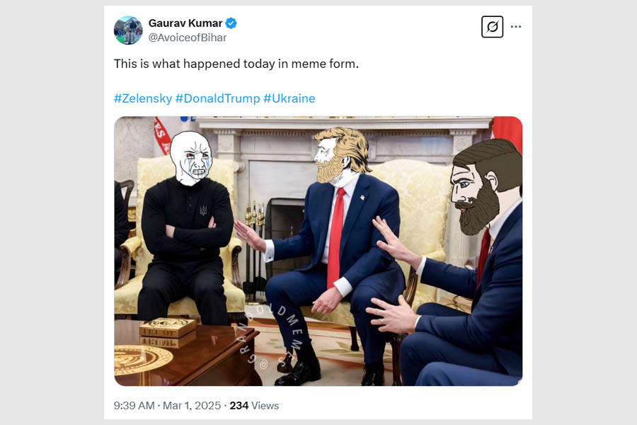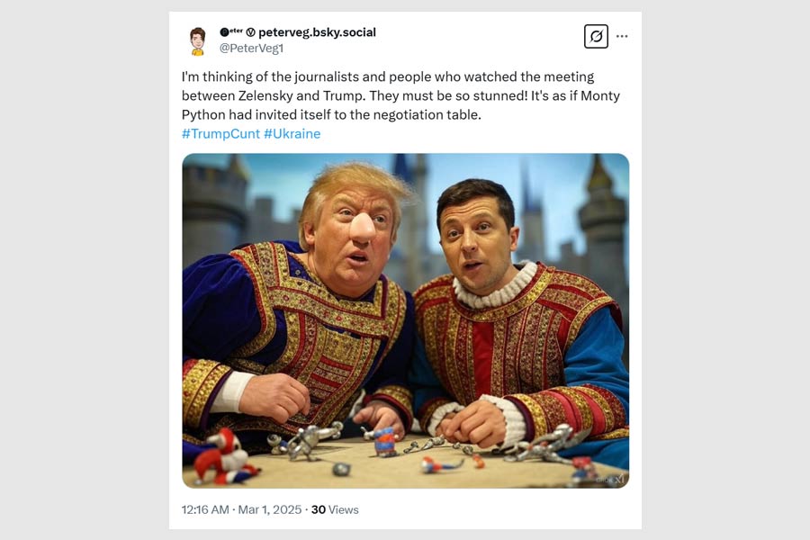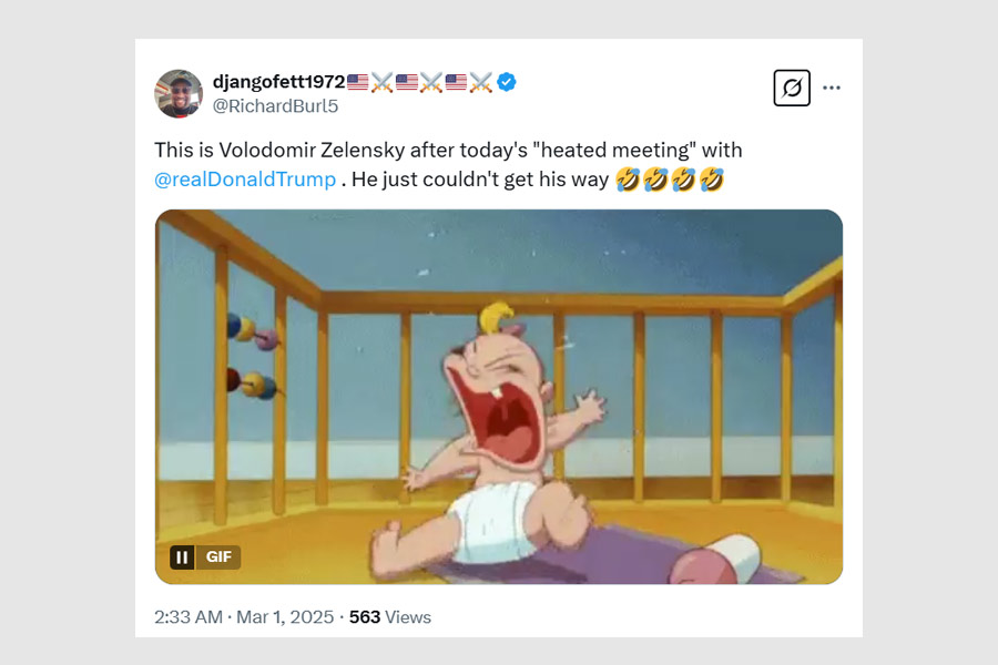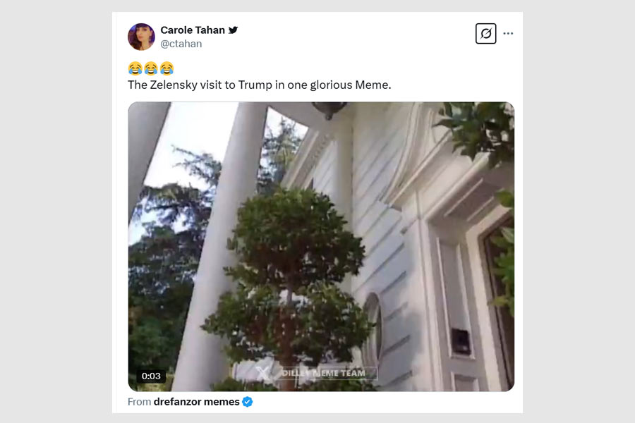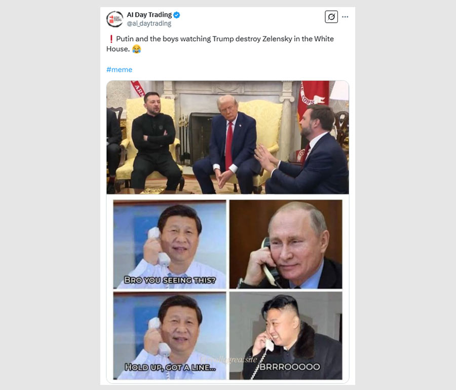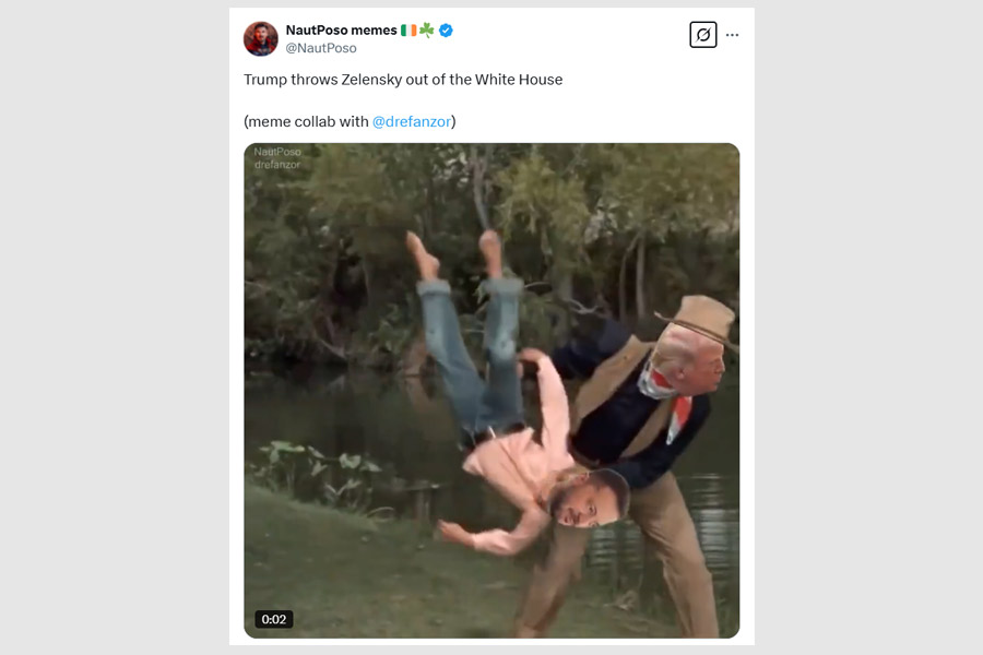 Social media erupted with memes and quips. “Breaking! Vladimir Putin has offered to mediate a peace deal between Trump and Zelensky,” read one forward.