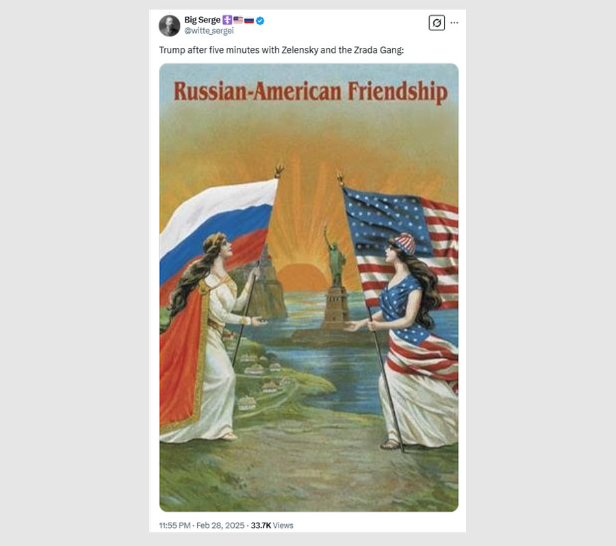 A pro-Russia meme that is also a pro-America meme – the miracle of the 21st century – shows Trump telling Zelensky that it’s time for Ukrainians to stop dying, and Zelensky refusing.