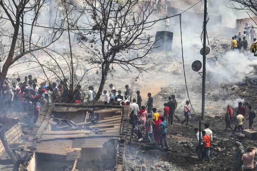 The fire engulfed over 800 densely packed shanties spread across around five acres. Thick plumes of smoke billowed into the sky as fire fighters battled the flames.