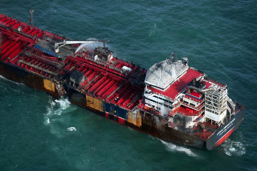 Aerial TV footage on Tuesday showed a gaping hole in Stena Immaculate's hull, with fire damage along its length, although the flames that engulfed the vessel after the collision appeared to have subsided.