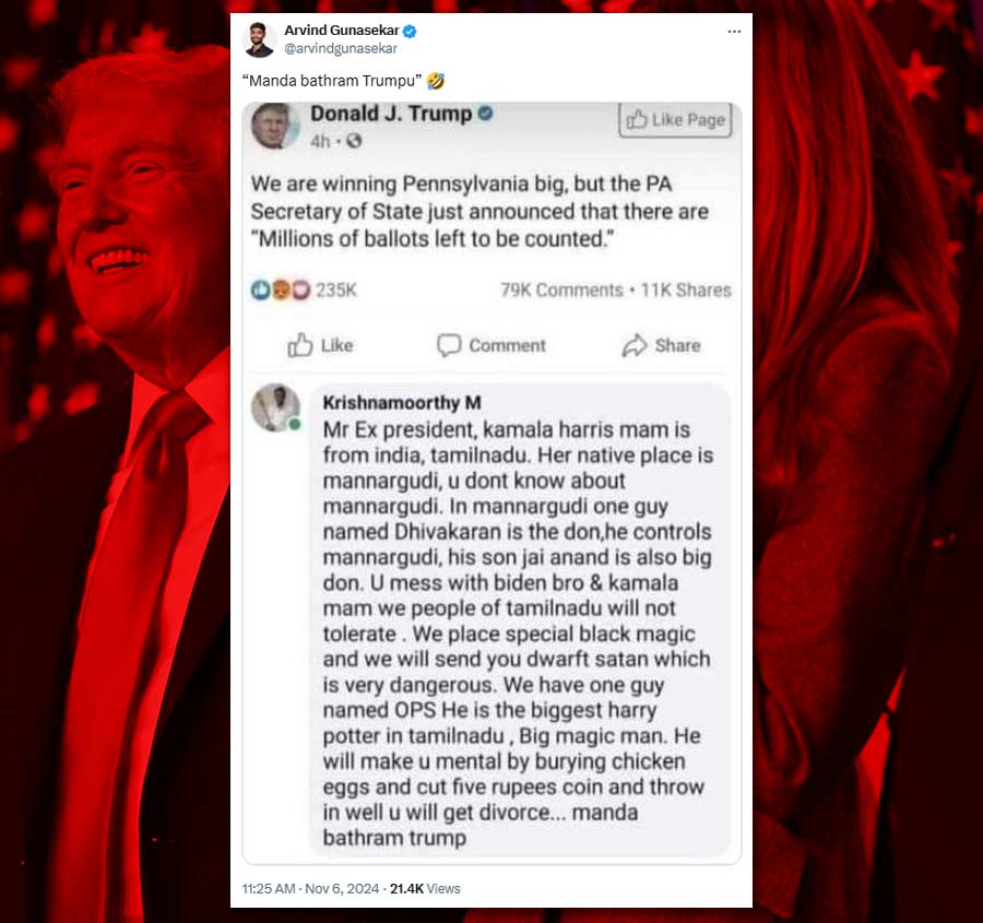 Listen up, Trump…mess with Kamala, and Mannargudi’s finest sorcerer (better than Harry Potter) will be out there burying chicken eggs and throwing five-rupee curses in wells until you’re divorced and broke!