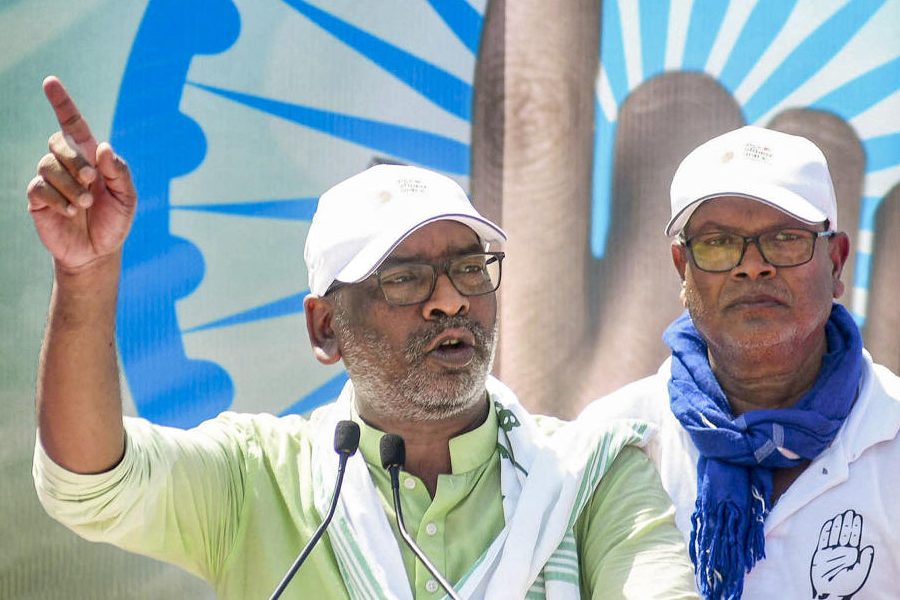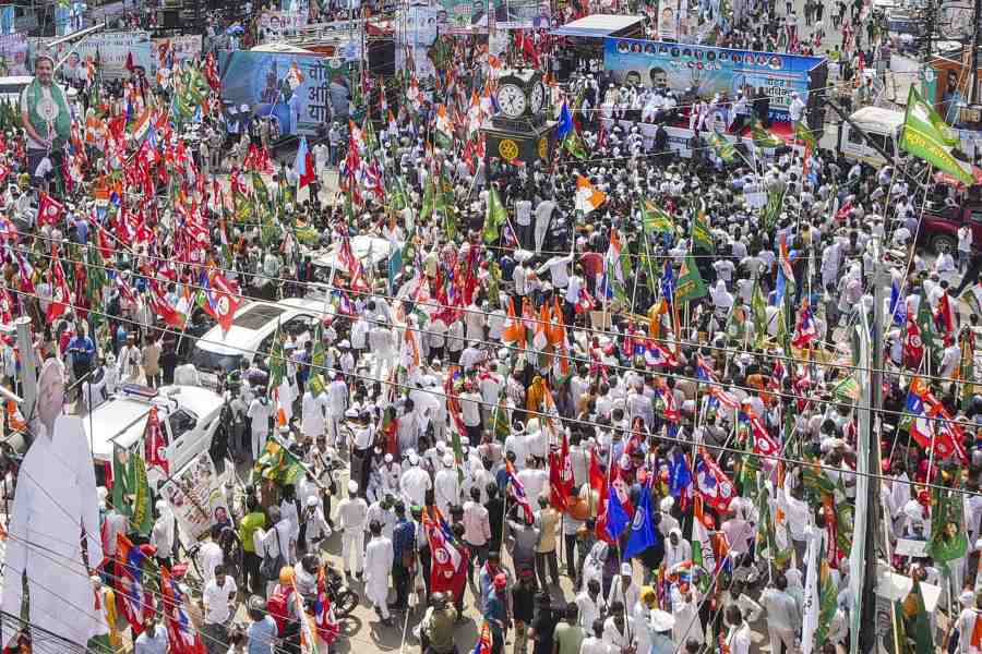 The INDIA bloc leaders, including Congress president Mallikarjun Kharge, Jharkhand chief minister Hemant Soren, RJD’s Tejashwi Yadav, CPI(ML) Liberation’s Dipankar Bhattacharya, Shiv Sena (UBT)’s Sanjay Raut, TMC’s Yusuf Pathan, CPI(M)’s M.A. Baby, and CPI’s Annie Raja, walked together before the police stopped the procession at Dak Bungalow crossing.