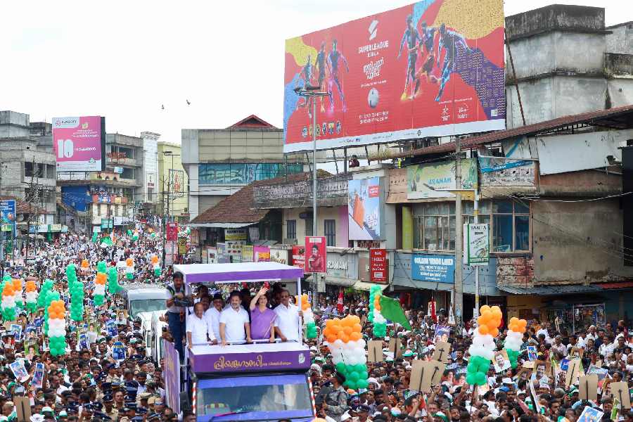 As the roadshow moved forward sedately, Priyanka and Rahul waved to the massive crowd and even picked up a small girl -- wearing a headband in support of the UDF -- into the vehicle. The child travelled with them briefly.