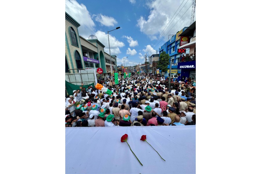 Green flags of IUML and the tricolour of the Congress, which were absent during Rahul Gandhi's roadshow in April this year, were also seen, but in very few numbers.