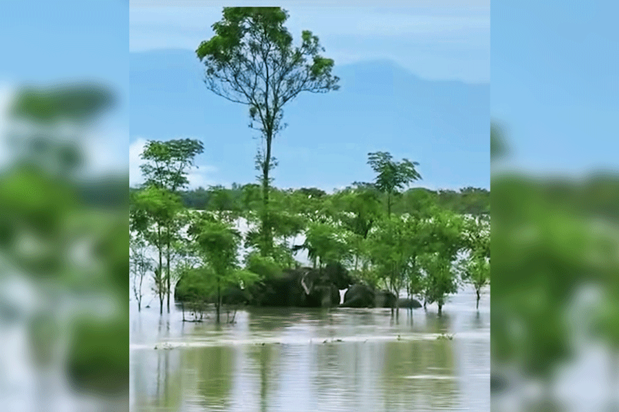 A rhinoceros, swollen and half-submerged in the overflowing waters of the Jaldhaka river inside the Gorumara National Park, captured the toll on wildlife in Sunday’s floods in North Bengal.