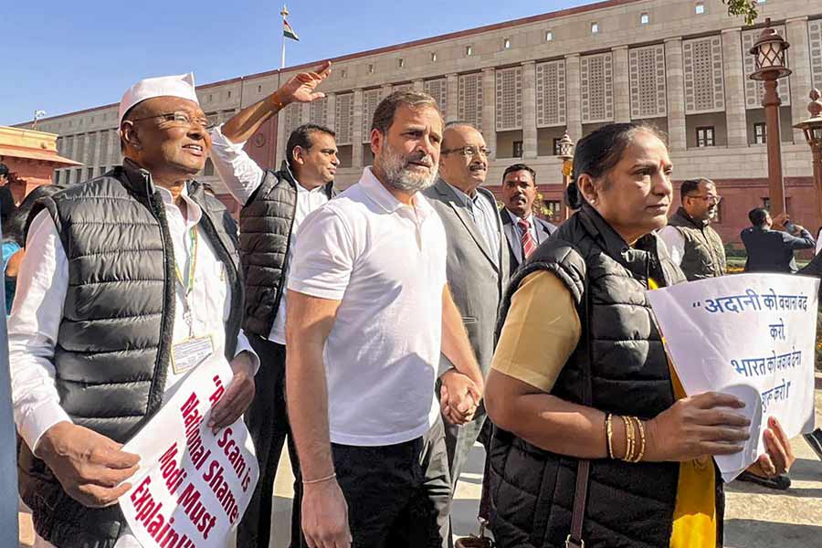 In an unusual protest, leaders of several INDIA bloc parties wore black jackets with stickers reading "Modi Adani Ek Hai" and "Adani Safe Hai" on them and raised slogans on the Parliament premises to demand a joint parliamentary probe into the Adani issue.