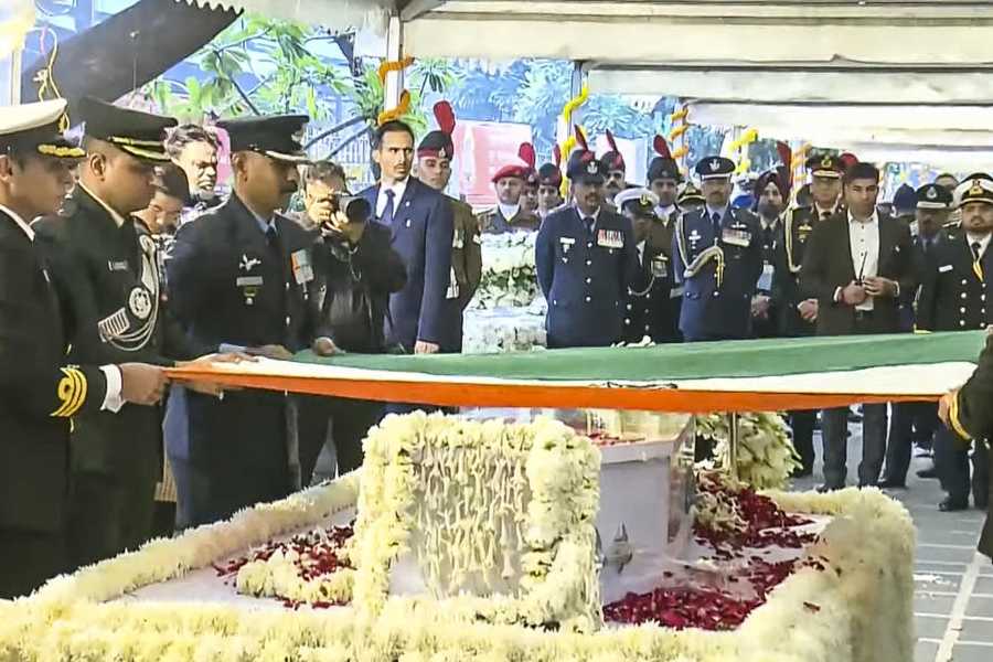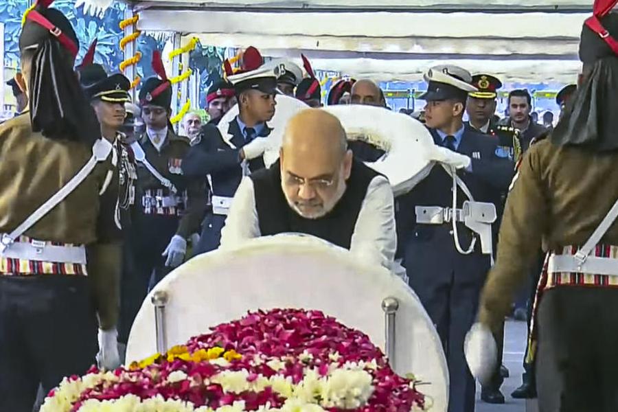 Singh's mortal remains were placed in a flower-bedecked vehicle and security personnel and party workers walked along the funeral route to finally reach Nigambodh Ghat around 11.30 am. Draped in the Tricolour, the flower-bedecked casket was placed on a raised platform at the ghat where leaders cutting across party lines laid wreaths on Singh's mortal remains.