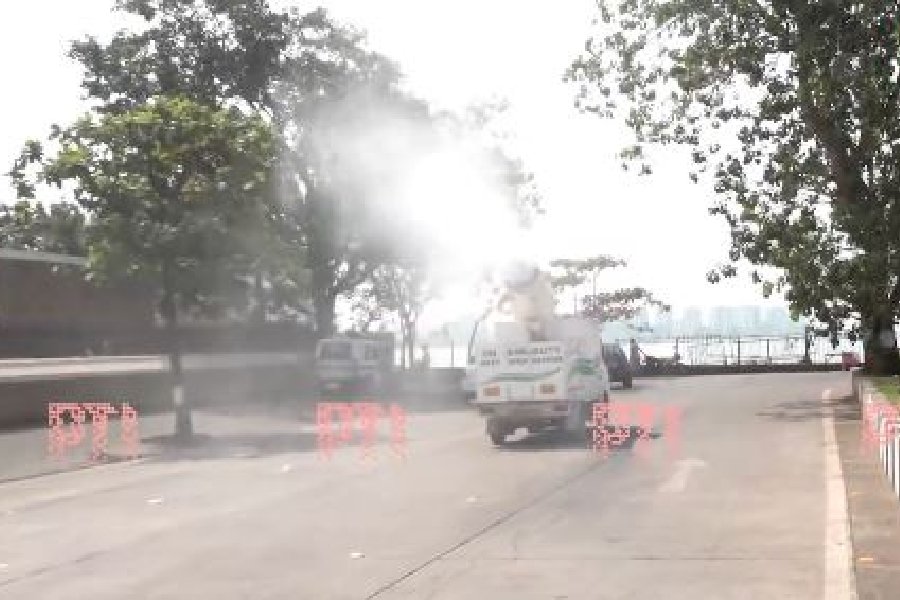 Brihanmumbai Municipal Corporation (BMC) sprinkles water at Nariman Point in Mumbai using mist-spraying machine to control air pollution.