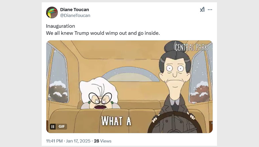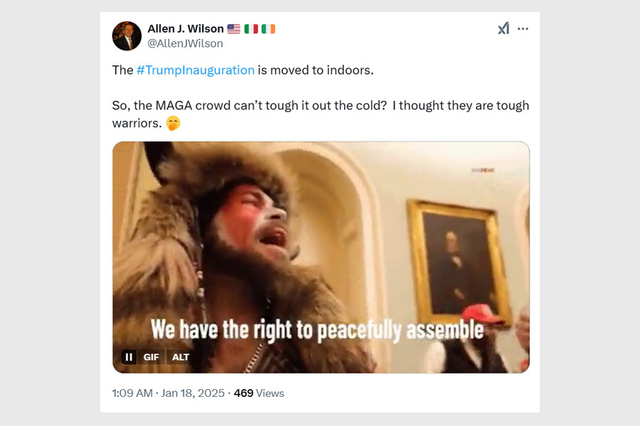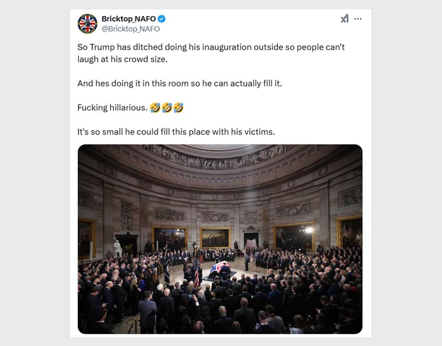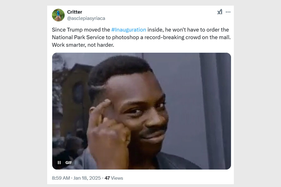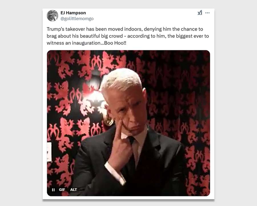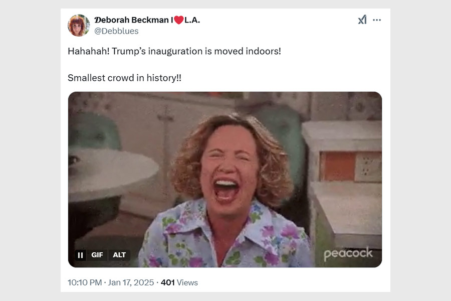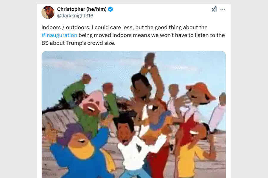 “Hahahah! Trump’s inauguration is moved indoors! Smallest crowd in history!” a user exclaimed, paired with a gif of uncontrollable laughter.