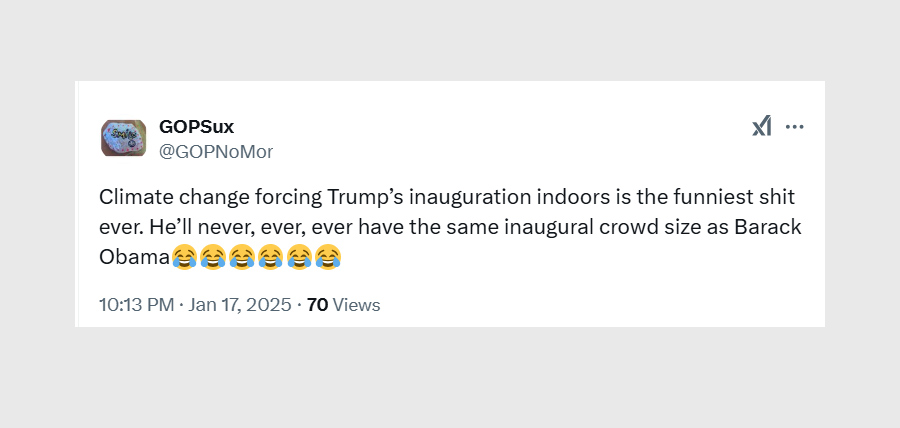 “Climate change forcing Trump’s inauguration indoors is the funniest shit ever,” one person wrote, pointing out the irony. “He’ll never have a crowd like Obama’s.”