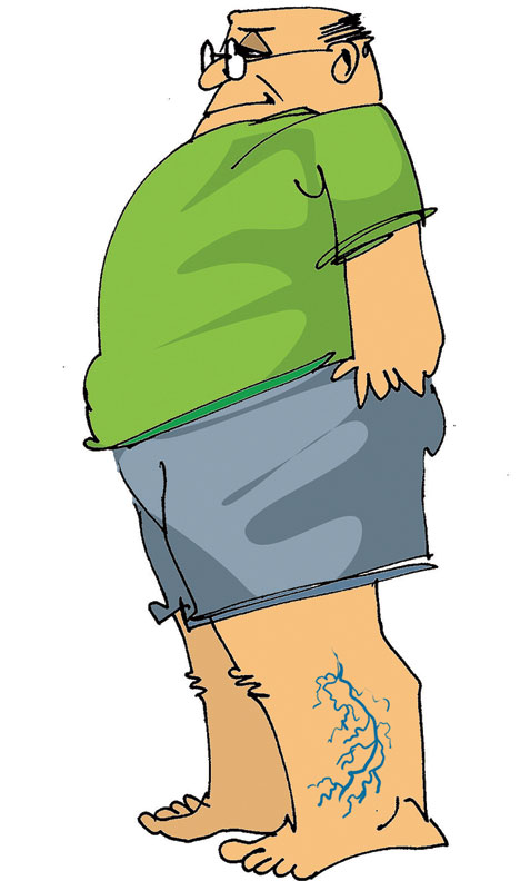 Varicose veins appear as bluish swellings on the legs, usually on both sides and cause a dull, throbbing pain. They occur if valves in the veins are weak, making it difficult for blood to be pumped back into the heart from the legs. They are usually seen in people whose BMI (weight divided by height in metre squared) is greater than 30, in women during pregnancy or in those who sit or stand long hours for work. Wearing compression stockings, exercise and losing weight help.