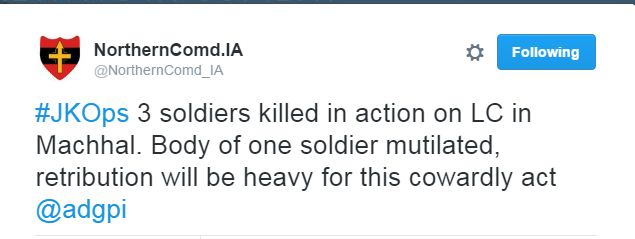 “Three soldiers killed in action on LC (Line of Control) in Machhal. Body of one soldier mutilated,” the Army said.