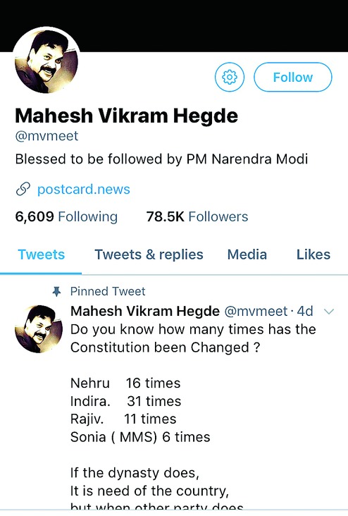Thursday night's arrest of Mahesh Vikram Hegde, Postcard News founder who is followed on Twitter by Prime Minister Narendra Modi, set off a social-media storm in his support and prompted Union minister Anant Kumar Hegde to accuse Karnataka's Congress government of a "dictatorial" act.