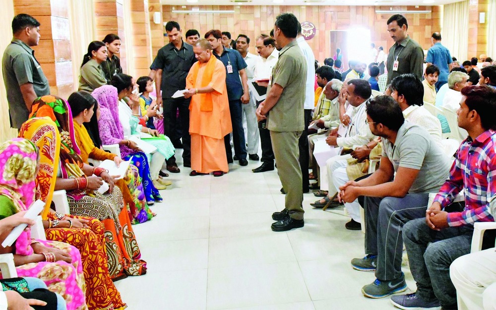 Picture shows Adityanath listening to people's problems at his janata darbar in Lucknow on Monday. (PTI)