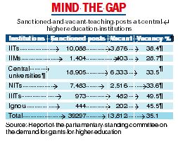 A report by the standing committee on education, headed by BJP member Vinay Sahashrabudhe, shows that more than a third of sanctioned teaching posts are vacant in central higher education institutions.