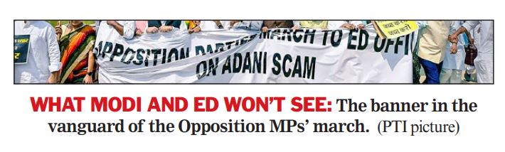 Most MPs asked if the government existed to facilitate loot by Adani and to defend the conglomerate when wrongdoings got exposed. Describing it as the biggest scam in independent India, they said Modi did not want any discussion on the Adani affair in Parliament, in the media or on the streets. Congress leader Adhir Chowdhury said: “If the government accepts a JPC (joint parliamentary committee probe), the real face of the BJP and Modi will come out before the people. That’s why they are using all their might to block the investigation.”