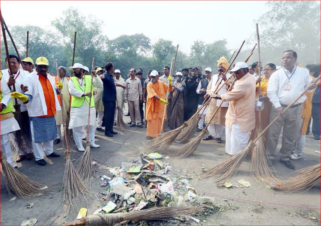 Donning a mask and rubber gloves, Adityanath was accompanied by about 500 members of the ruling Bharatiya Janata Party, including lawmakers from western Uttar Pradesh, as he swept a parking area, in an apparent bid to promote the Swachh Bharat mission.