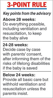 The IMA-IAP-NNF advisory has cited neonatal resuscitation 2015 guidelines from the American Academy of Pediatrics and the American Health Association that say: "There is no evidence to support the use of any particular delivery-room prognostic score presently available over gestational age assessment alone, in preterm infants at less than 25 weeks gestation."