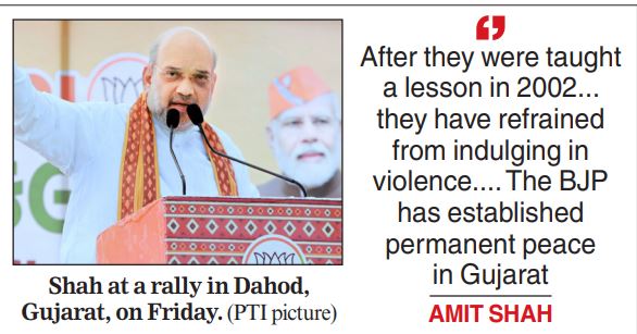 Home minister Amit Shah told an election rally on Friday that the BJP had established “permanent peace” in Gujarat after Congress-supported perpetrators of violence were “taught a lesson” in 2002.